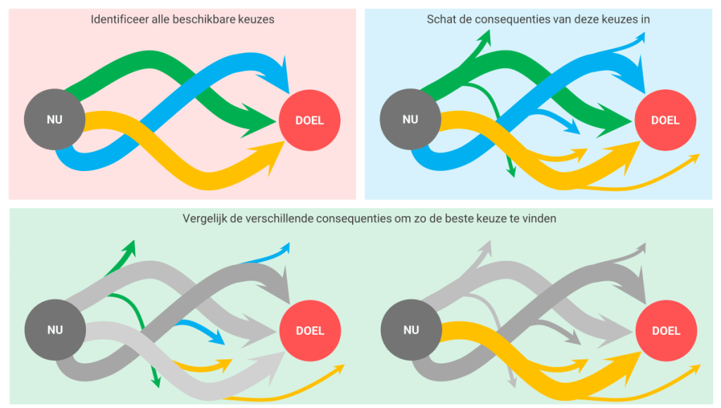 - Optimale keuze maken: de beslisser kiest de optie met de beste uitkomst en het hoogste effect.