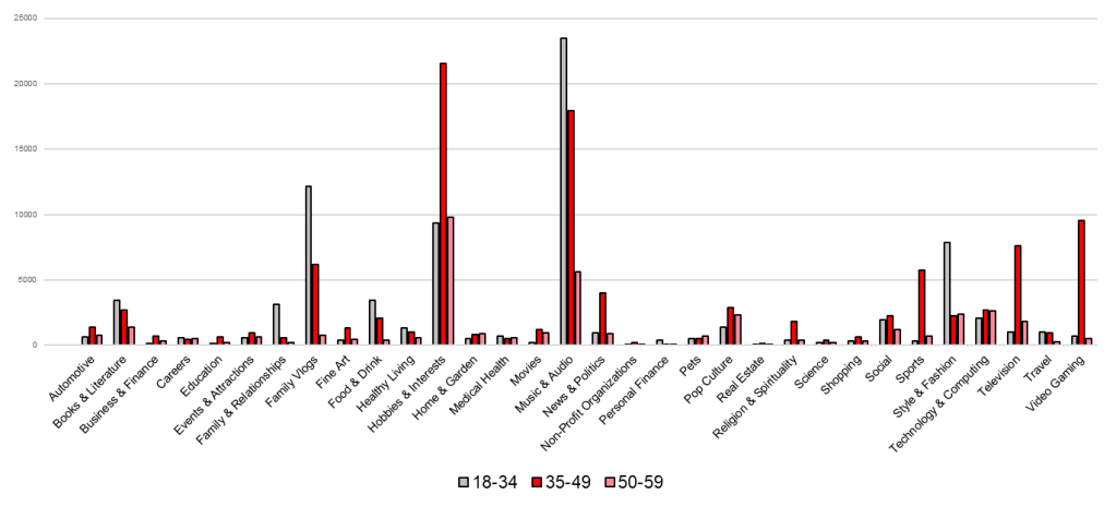 De populairste content categorieen zijn over alle doelgroepen heen: Music/Audio, Hobbies/Interest, Family vlogs en TV news. Als we dieper in de verschillen tussen leeftijdsgroepen inzoomen zien we de dat jongeren (18-34 jaar) meer muziek en family vlogs kijken, de 35-49-jarigen kijken meer hobby’s en gaming en de oudere groep 50-59-jarigen houden meer van tech en pop culture.